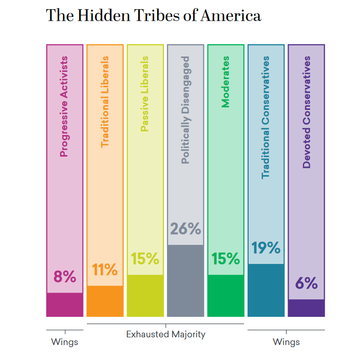 First, lets take a look at these factions, what are described as the “Hidden Tribes”. The polling indicates that the general public breaks down into roughly seven “tribes”: Progressive Activists (8%), Traditional Liberals (11%), Passive Liberals (15%), Politically Disengaged (26%), Moderates (15%), Traditional Conservatives (19%), and Devoted Conservatives (6%).
