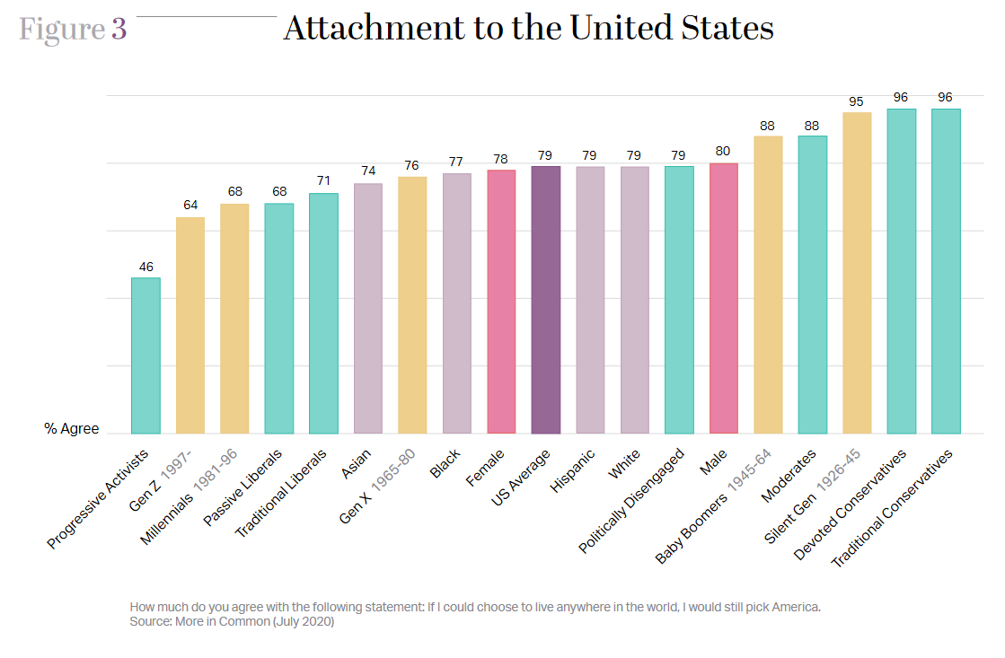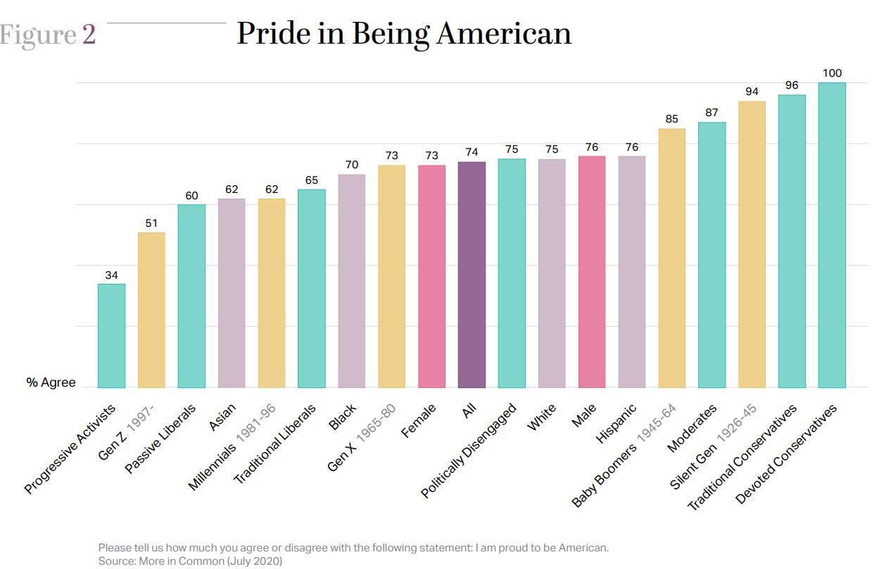 It seems the only group who is not very proud to be Americans are “progressive activists.” Gen Z comes in at 51% (which I attribute to our genuinely awful, politicized educational system), but all other groups are overwhelmingly proud of the nation.
