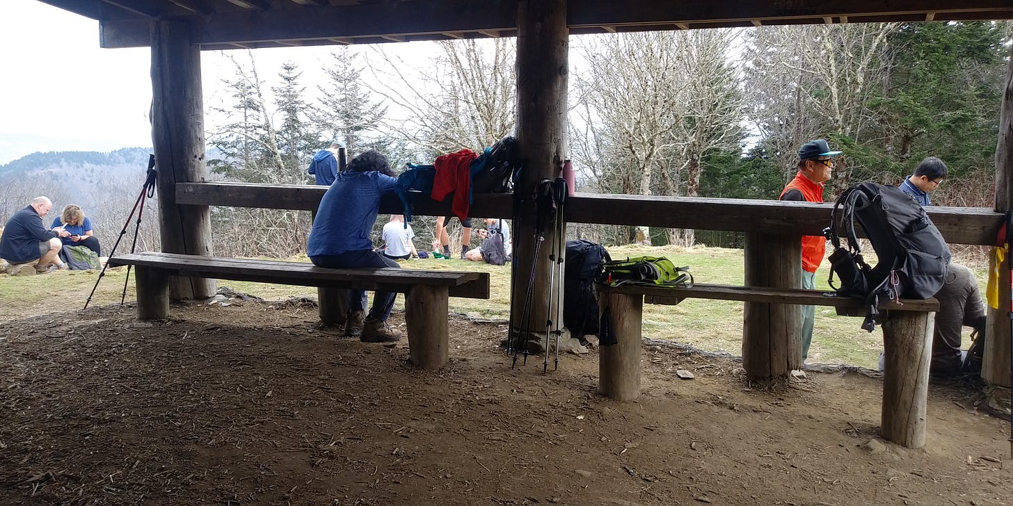 I have a signal here, food, a spring and an outhouse, and it really doesn't matter at all that I stop here. Tomorrow is another day. Because this shelter is just 4 miles from Newfound Gap, a major parking area for day hikers, the shelter features a stream of interesting parties. A group of ten Japanese tourists are here for lunch, a couple of young guys planning a thru-hike for next year just departed, and more folks come and go moment to moment. It looks like this from inside the shelter, looking out:
